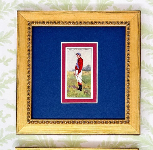 Pair of Framed Antique Jockey Horse Cigarette Card c. 1920s, Red and Blue