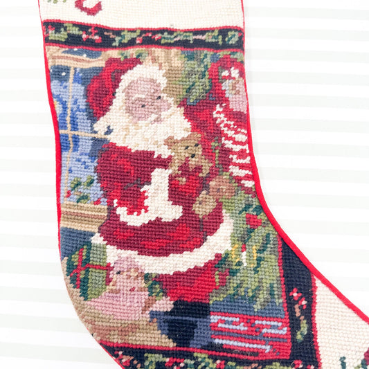 Vintage Needlepoint Christmas Stocking, Santa Claus by Fireplace