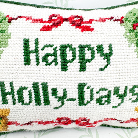 Vintage Christmas Needlepoint Pillow, Happy Holly-days