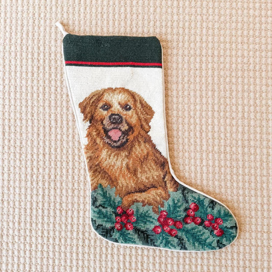 Vintage Needlepoint Dog Christmas Stocking, Golden Retriever
