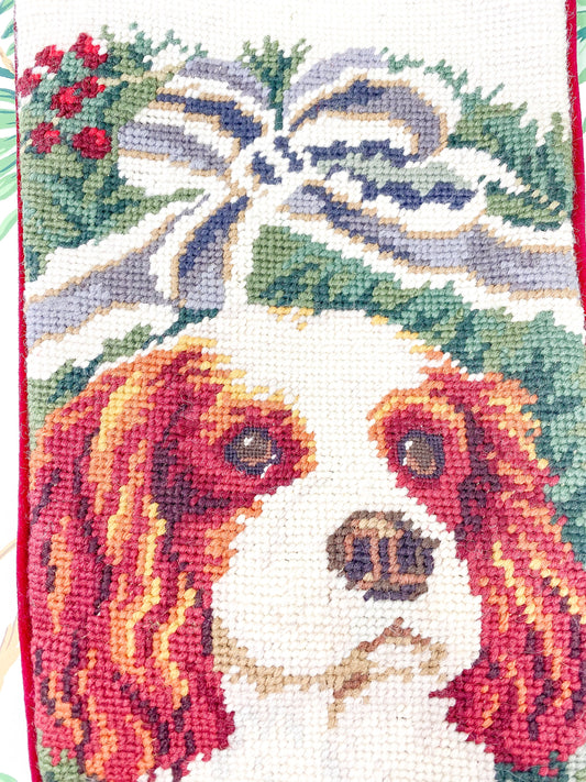 Vintage Needlepoint Dog Christmas Stocking, King Charles Cavalier Spaniel
