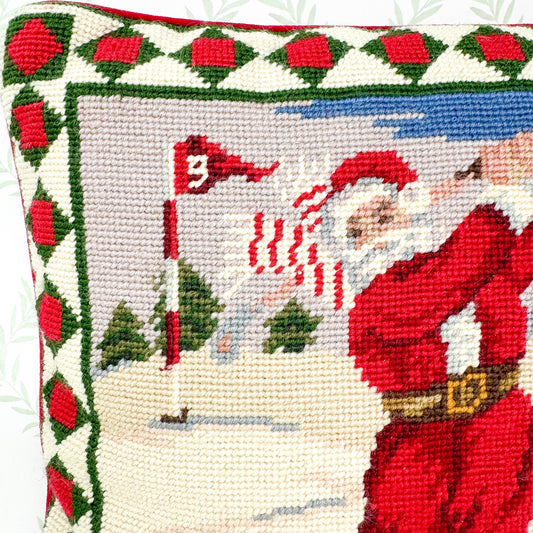 Vintage Needlepoint Christmas Pillow, Santa Golfing, 14"