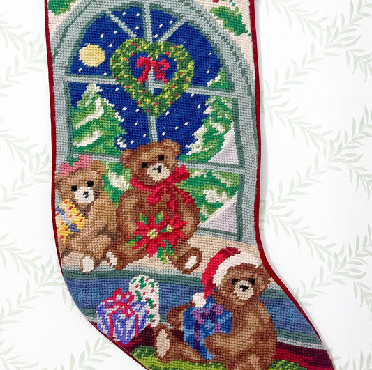 Vintage Needlepoint Christmas Stocking, Teddy Bears