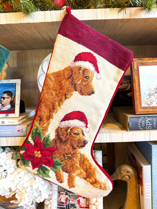 Vintage Needlepoint Dog Christmas Stocking, Golden Retriever
