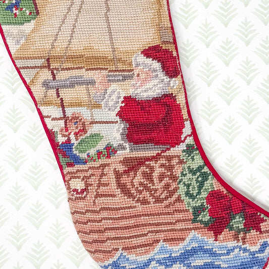 Vintage Needlepoint Christmas Stocking, Santa Sailing