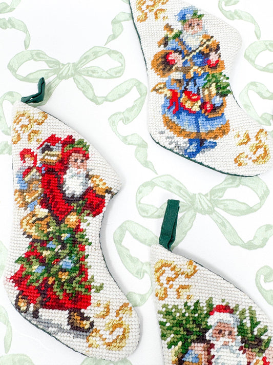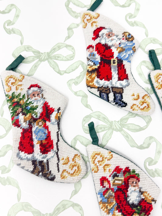 Vintage Mini Needlepoint Christmas Stockings, Santa Claus, Set of 4