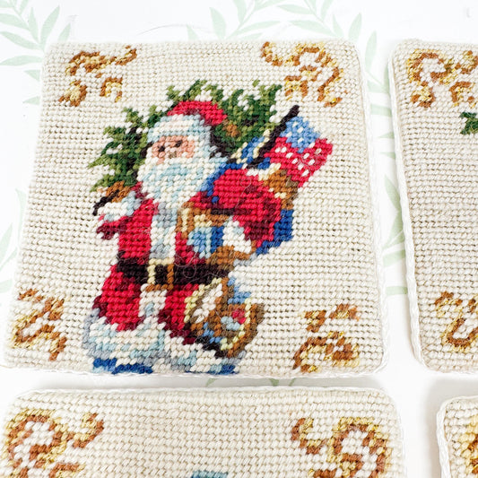 Vintage Needlepoint Christmas Coasters, Santa Claus, Set of 6
