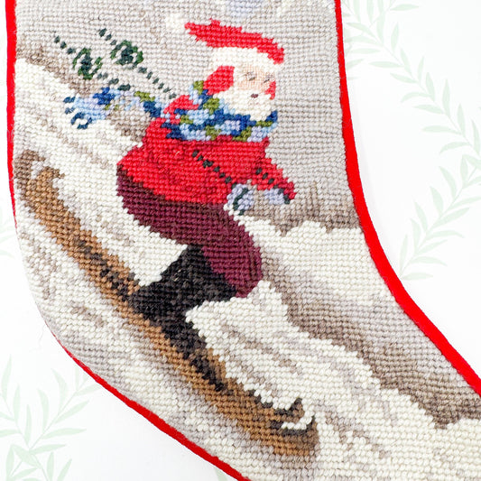 Vintage Needlepoint Christmas Stocking, Santa Skiing
