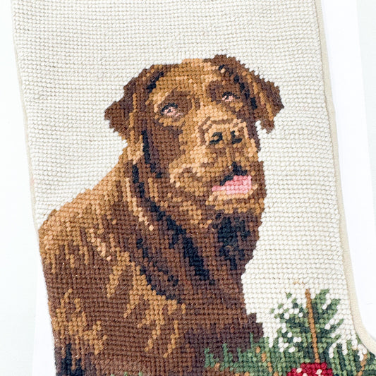 Vintage Needlepoint Dog Christmas Stocking, Chocolate Labrador Retriever