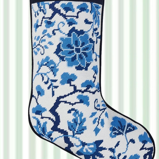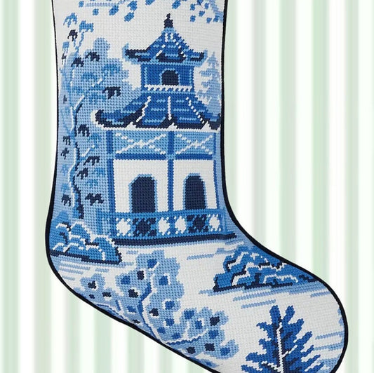 Blue Pagoda Chinoiserie Needlepoint Stocking