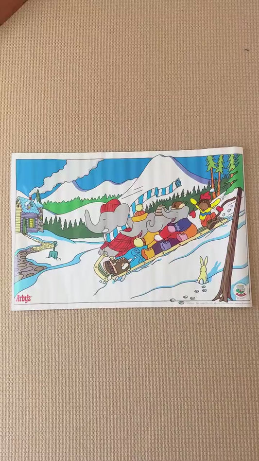 Vintage Babar Poster, Family Sledding in Snow