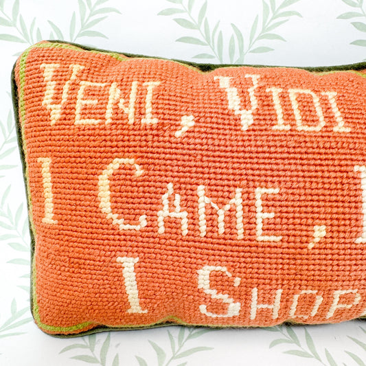 Vintage Needlepoint Pillow, Veni, Vedi, Visa, I Came, I Saw, I Shopped