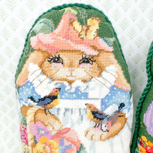 Pair of 15" Handmade Bucilla Needlepoint Farmer Bunny Rabbit Standing Pillows