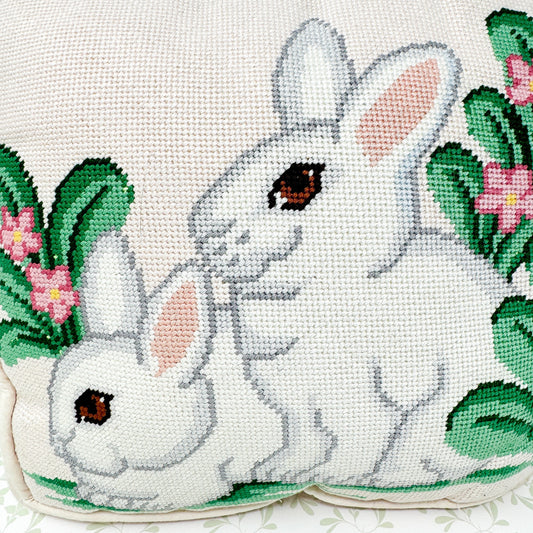 Vintage Handmade Needlepoint Pillow, Pink and Green Rabbits