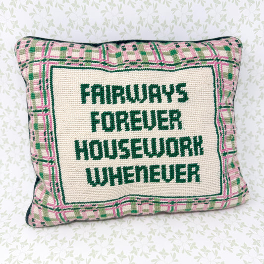 Vintage Needlepoint Pillow, Fairways Forever, Housework Whenever