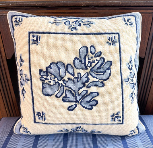 Vintage Hand Stitched Blue and White Needlepoint Pillow, 13"