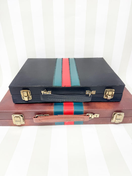 Vintage Backgammon Set, Gucci Style Black Leather Case with Red and Green Stripe